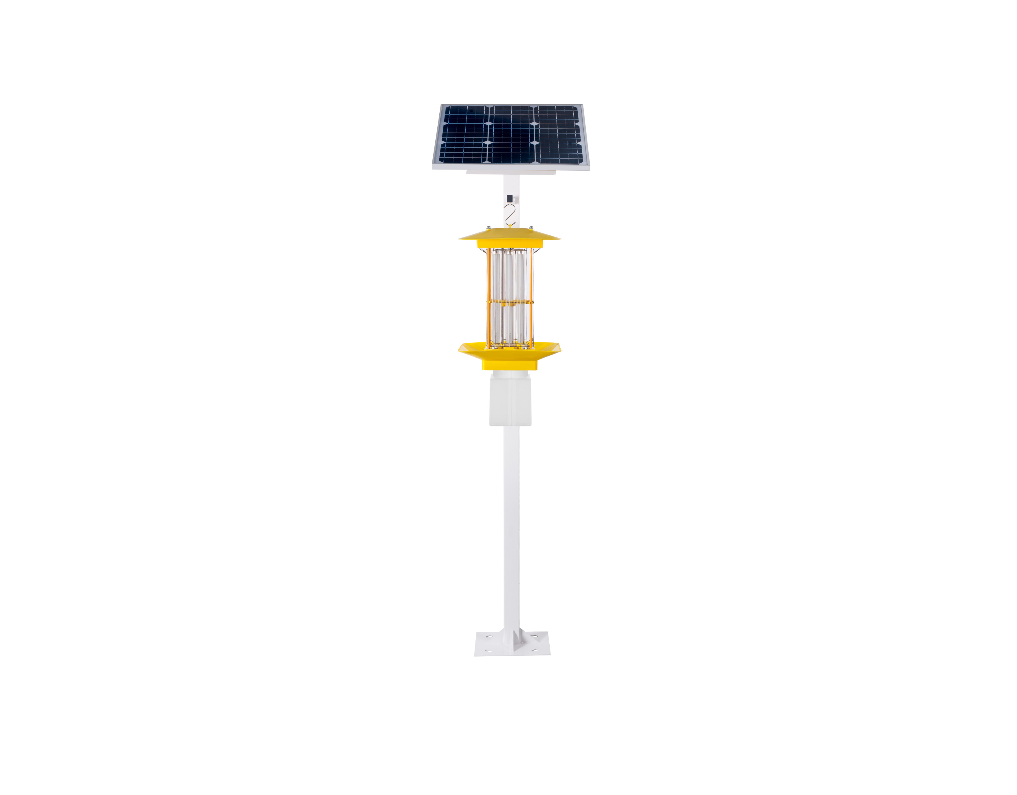 太阳能杀虫灯是一款物理灭虫器械,利用光波引诱害虫成虫扑灯,然后风机转动产生负压气流将虫子吸入到收集器中,使之风干、脱水,达到杀虫的目的。开发的电击式杀虫灯,改进了光源和杀虫方法,突破了用常规杀虫灯杀灭小害虫的能力,大大提高了害虫的杀灭效率。该设备以太阳能电池板为电源,白天储存电源,晚上为杀虫灯提供电源,引诱害虫扑向灯源。