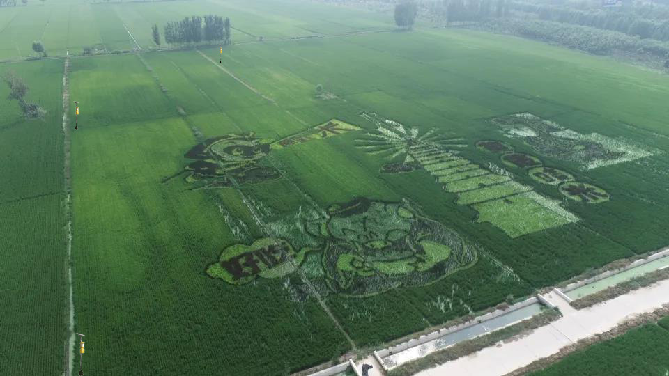 在平原示范区原武镇西合角村平坦开阔的稻田里,农民以稻田为“画布”,以彩稻为 “画笔”,共同绘制“乡村振兴”和“建党100周年”“猪八戒吃大米”主题稻田画。从空中俯瞰,绿色的田野里,好似绣上了一幅精美的字画。风吹稻浪、稻花芬芳,一片片朝气蓬勃的“幸福绿”里,承载着农业人的汗水和秋收的期望。